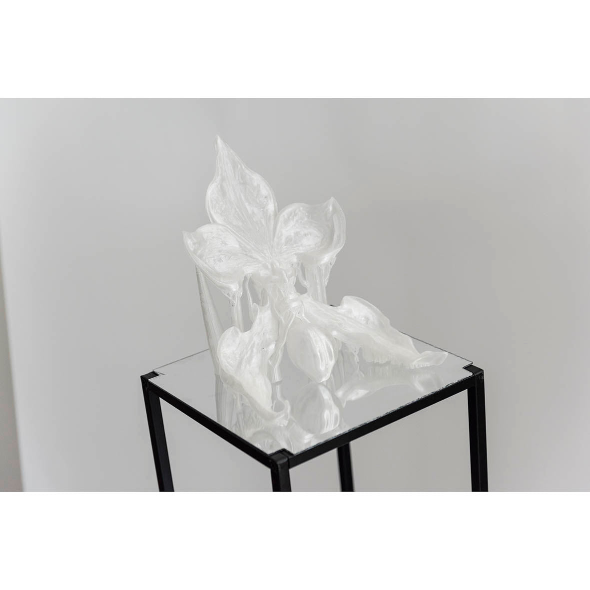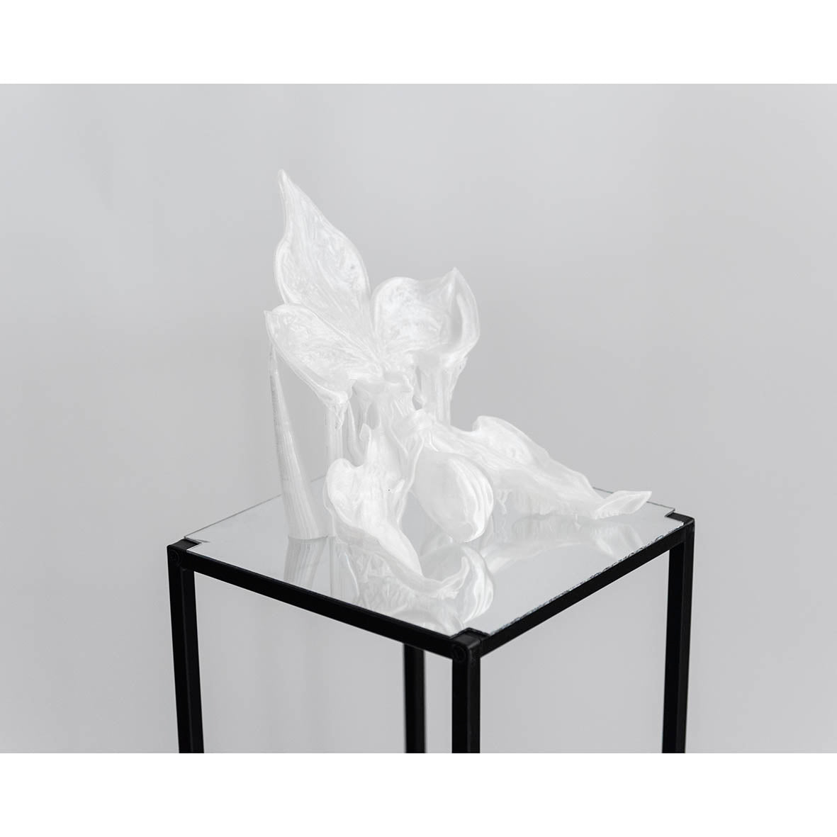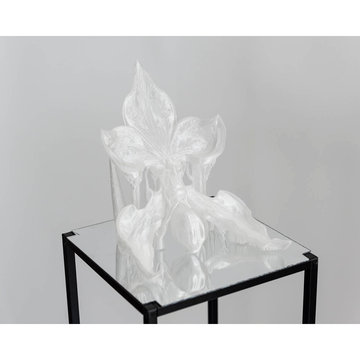 Artificially liquified 3D model of an orchid, printed with clear PETG filament resting on a mirror