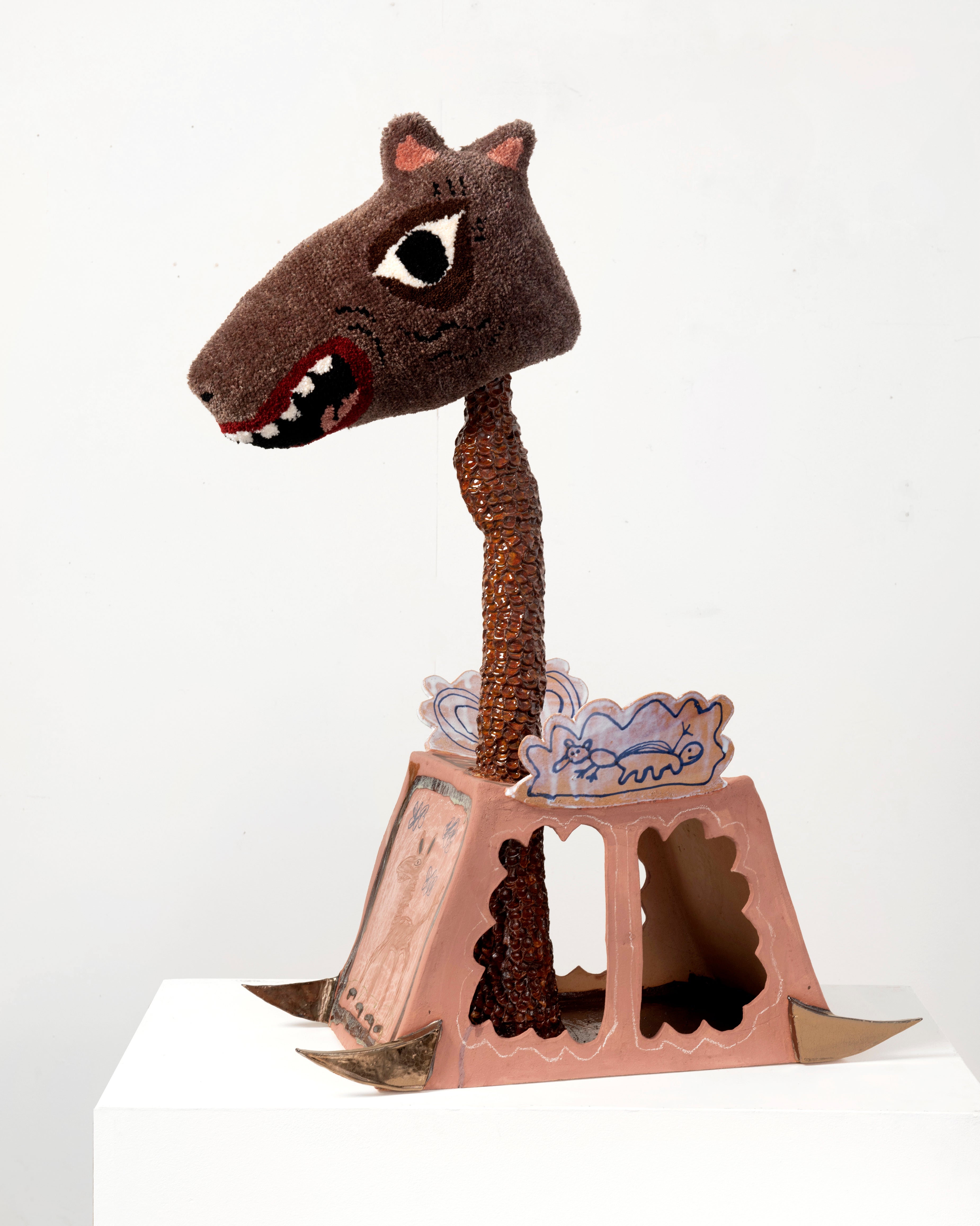 earthenware clay, underglaze crayon, cobalt carbonate oxide, glaze, epoxy, enamel, metal, acrylic and wool yarn, fabric, synthetic fibre
