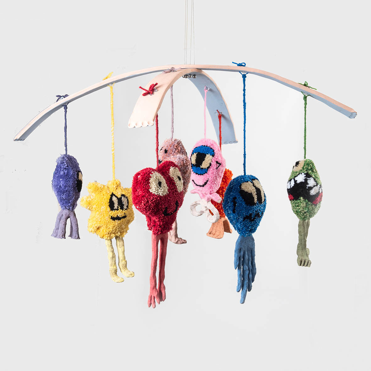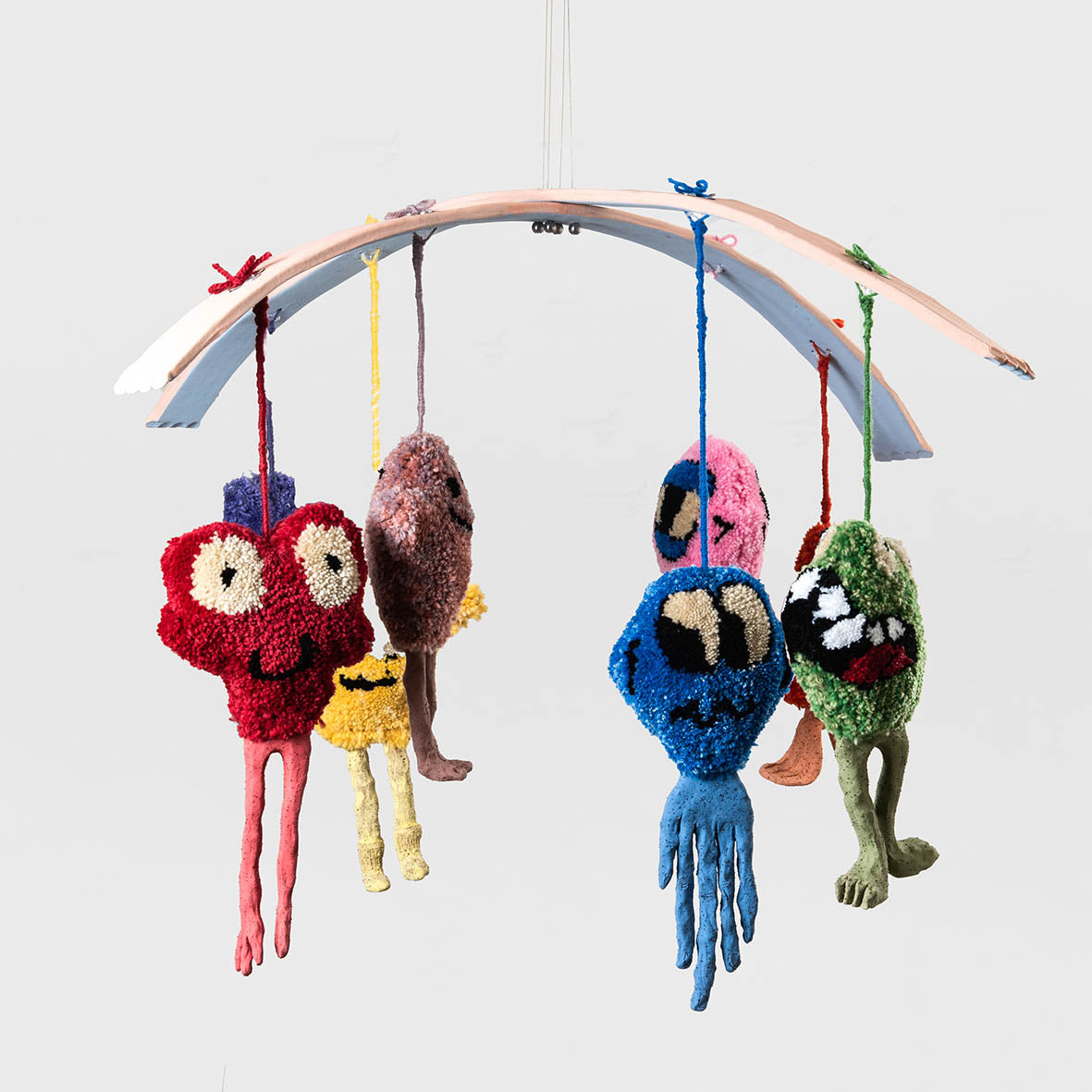 stoneware clay, underglaze, acrylic and wool yarn, fabric, synthetic fibre, nylon, stainless steel cables