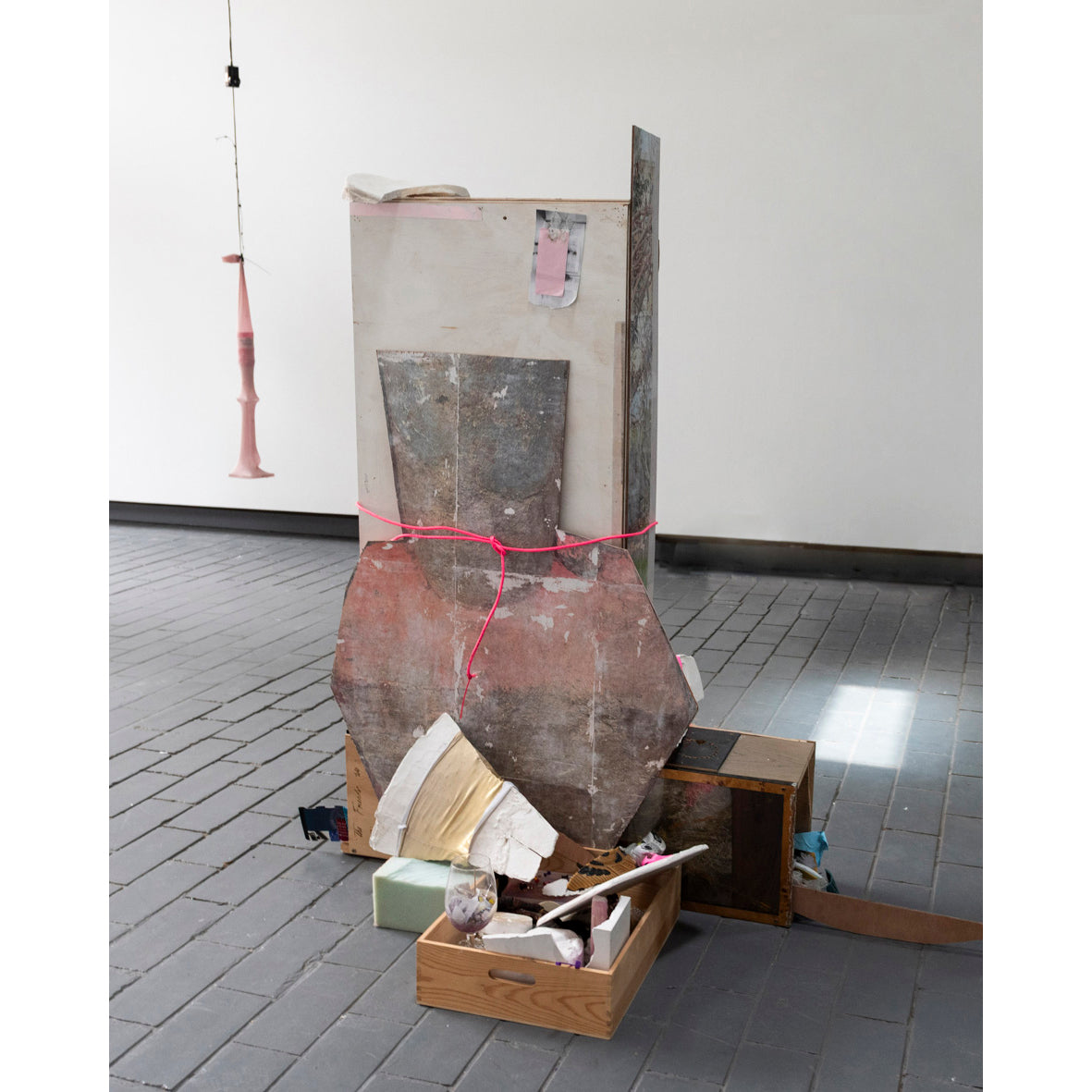 Gel medium transfers on plywood, acrylic paint, power cord, paper, tape, screws, plaster, staples, nails, glue, film slides, resin, confetti, perspex, a zip, spray paint, assorted pieces of wood, picture frames, crayon, glasses case, pins, foam, adhesive book covering, tape cassette, bobby pins, pipe, fake plant, plastic, flagging tape, shoes, balloon, lace, wine glass of studio dust, fake plait, sand, zip ties.