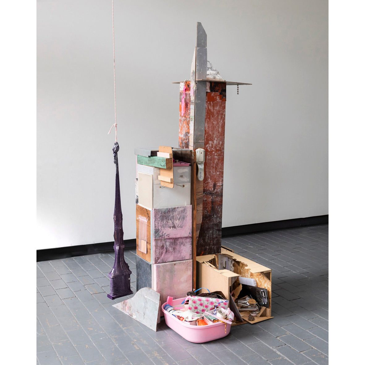 Gel medium transfers on tarpaulin, canvas, and plywood, staples, nails, screws, wood, paper, spray paint, plastic mesh, plaster, crystal perfume bottle, plastic soldier, metal beads, flagging tape, MDF, chipboard, acrylic paint, expanding foam, plastic strawberry, plastic beaded string, pieces of metal, rocks, display sign, adhesive book covering, broken lighter, paper with the lyrics of Savage’s song “SWING”, plastic balloon holders, sheet of diamantes, a pair of Pleasers, lingerie packaging, fishnet tights, decorative bow with white beads, mirrored tile, plaster casts of shells, metal hair clip, fake flowers, painting rag, tiles, Supreme Cash Cannon money, make-up, iPod, foam, feathers, shoes, pigment, wax, resin, beads, fake eyelashes, wall plugs, wire, glue, metal vent, placemat, small bottle of crystals, handkerchief package, mesh bag, lino, pins, stocking, trophy, rope.